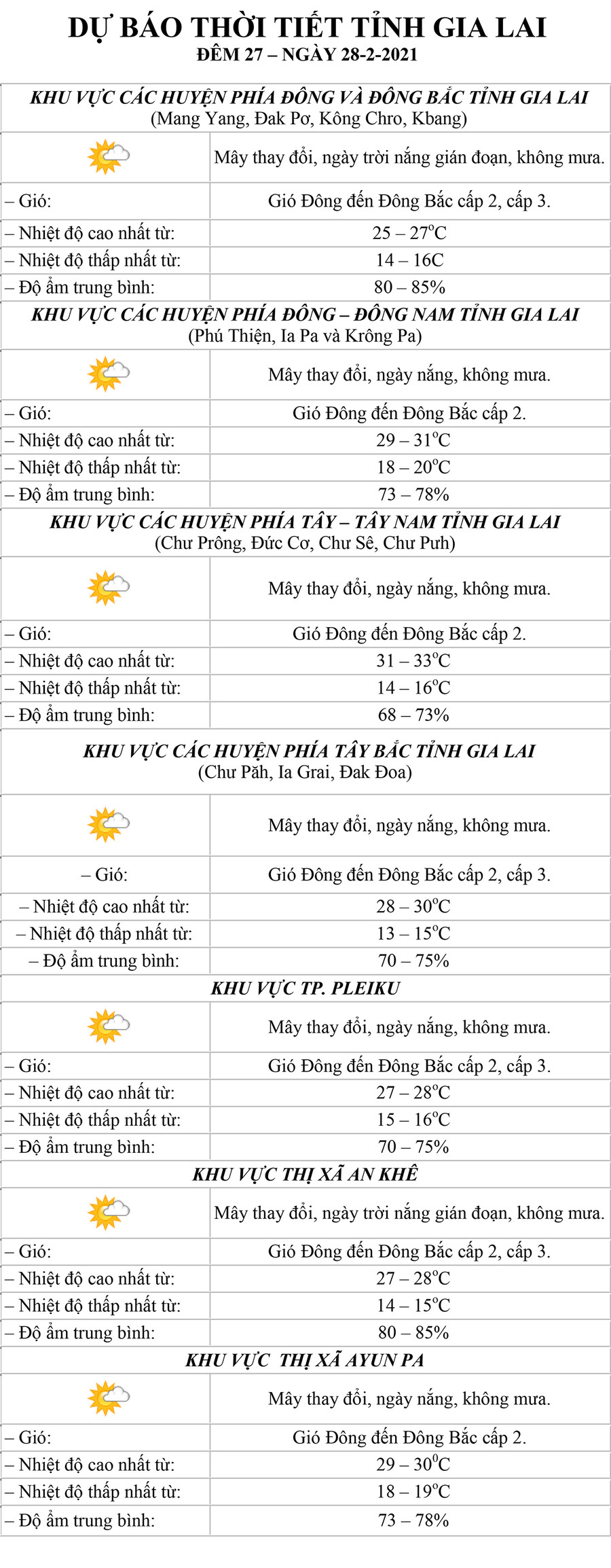(GLO)- Dự báo thời tiết tỉnh Gia Lai đêm 27-2 và ngày 28-2 tại khu vực: các huyện phía Đông và Đông Bắc, các huyện phía Đông-Đông Nam, các huyện phía Tây-Tây Nam, các huyện phía Tây Bắc, TP. Pleiku, thị xã An Khê và thị xã Ayun Pa.