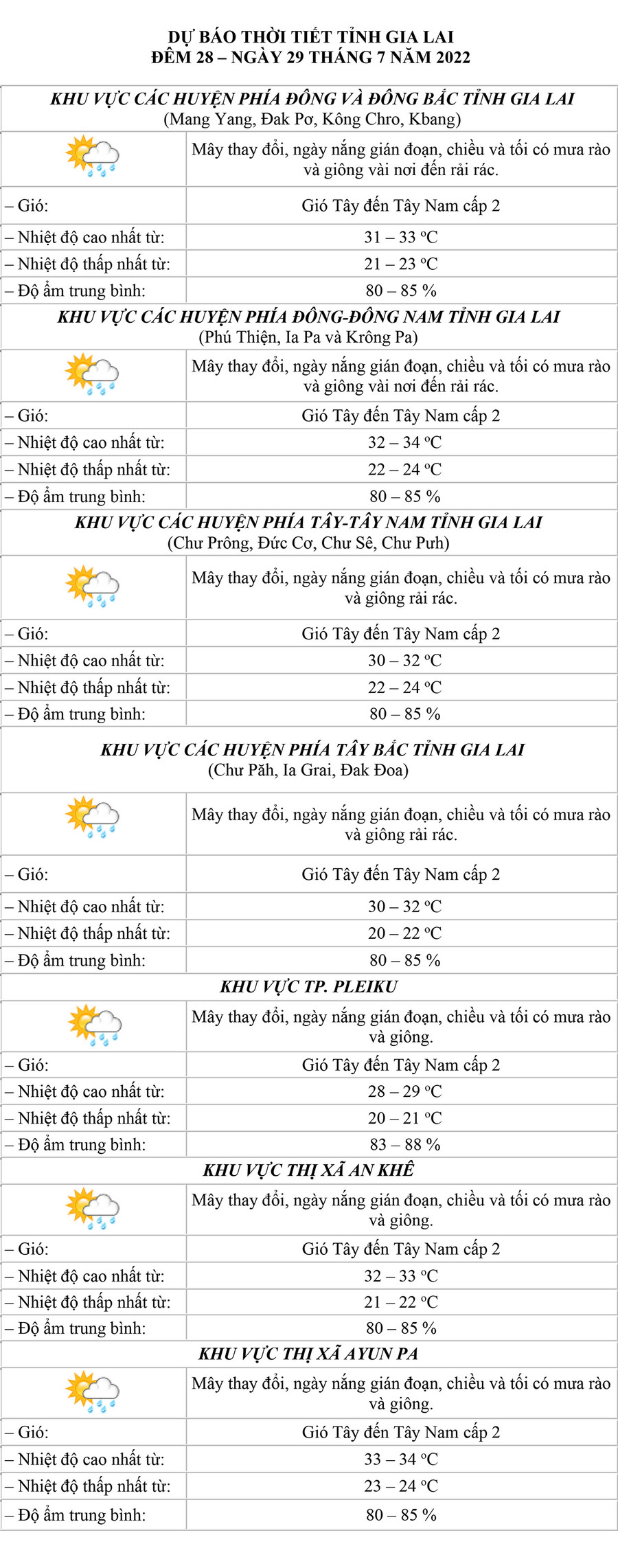 (GLO)- Dự báo thời tiết tỉnh Gia Lai đêm 28-7 và ngày 29-7 tại khu vực các huyện phía Đông và Đông Bắc, các huyện phía Đông-Đông Nam, các huyện phía Tây-Tây Nam, các huyện phía Tây Bắc, TP. Pleiku, thị xã An Khê và Ayun Pa.
