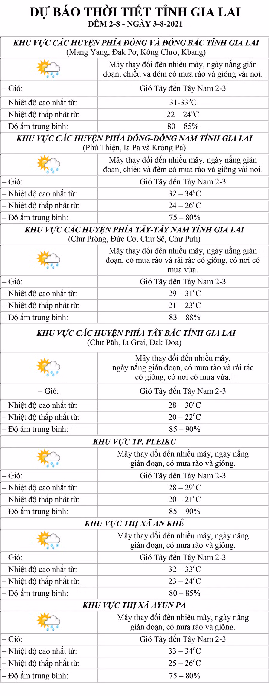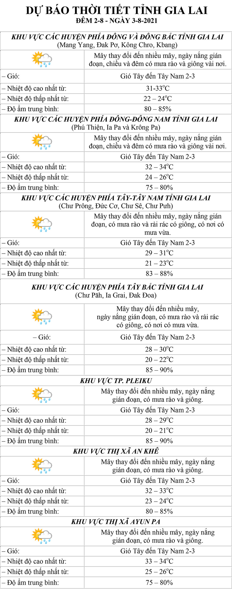 (GLO)- Dự báo thời tiết tỉnh Gia Lai đêm 2-8 và ngày 3-8 tại khu vực: các huyện phía Đông và Đông Bắc, các huyện phía Đông-Đông Nam, các huyện phía Tây-Tây Nam, các huyện phía Tây Bắc, TP. Pleiku, thị xã An Khê và thị xã Ayun Pa.