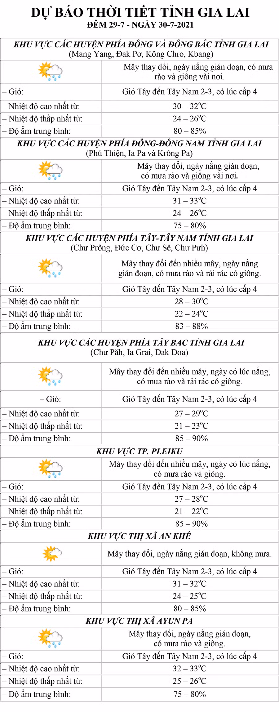 (GLO)- Dự báo thời tiết tỉnh Gia Lai đêm 29-7 và ngày 30-7 tại khu vực: các huyện phía Đông và Đông Bắc, các huyện phía Đông-Đông Nam, các huyện phía Tây-Tây Nam, các huyện phía Tây Bắc, TP. Pleiku, thị xã An Khê và thị xã Ayun Pa.