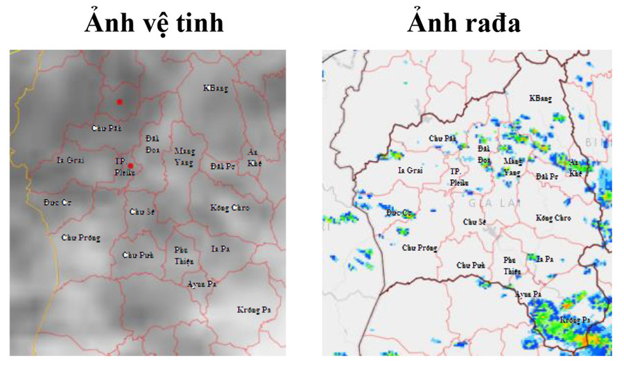 Qua theo dõi trên ảnh ra đa thời tiết Pleiku và ảnh mây vệ tinh cho thấy những vùng mây đối lưu tồn tại trên khu vực các huyện Kbang, thị xã An Khê, Đak Pơ, Kông Chro, Krông Pa, Mang Yang, Đak Đoa và Đức Cơ. Hiện tại những vùng mây này có xu hướng phát triển và mở rộng thêm.