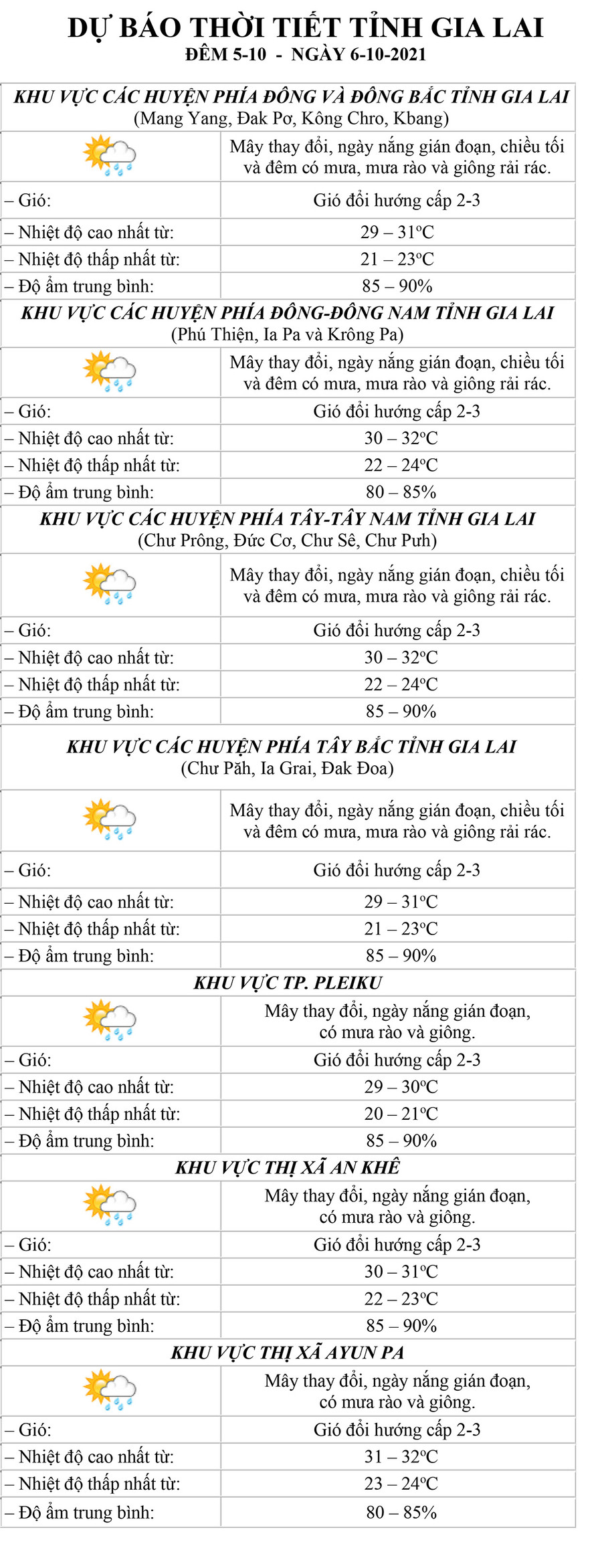 (GLO)- Dự báo thời tiết tỉnh Gia Lai đêm 5-10 và ngày 6-10 tại khu vực: các huyện phía Đông và Đông Bắc, các huyện phía Đông-Đông Nam, các huyện phía Tây-Tây Nam, các huyện phía Tây Bắc, TP. Pleiku, thị xã An Khê và thị xã Ayun Pa.