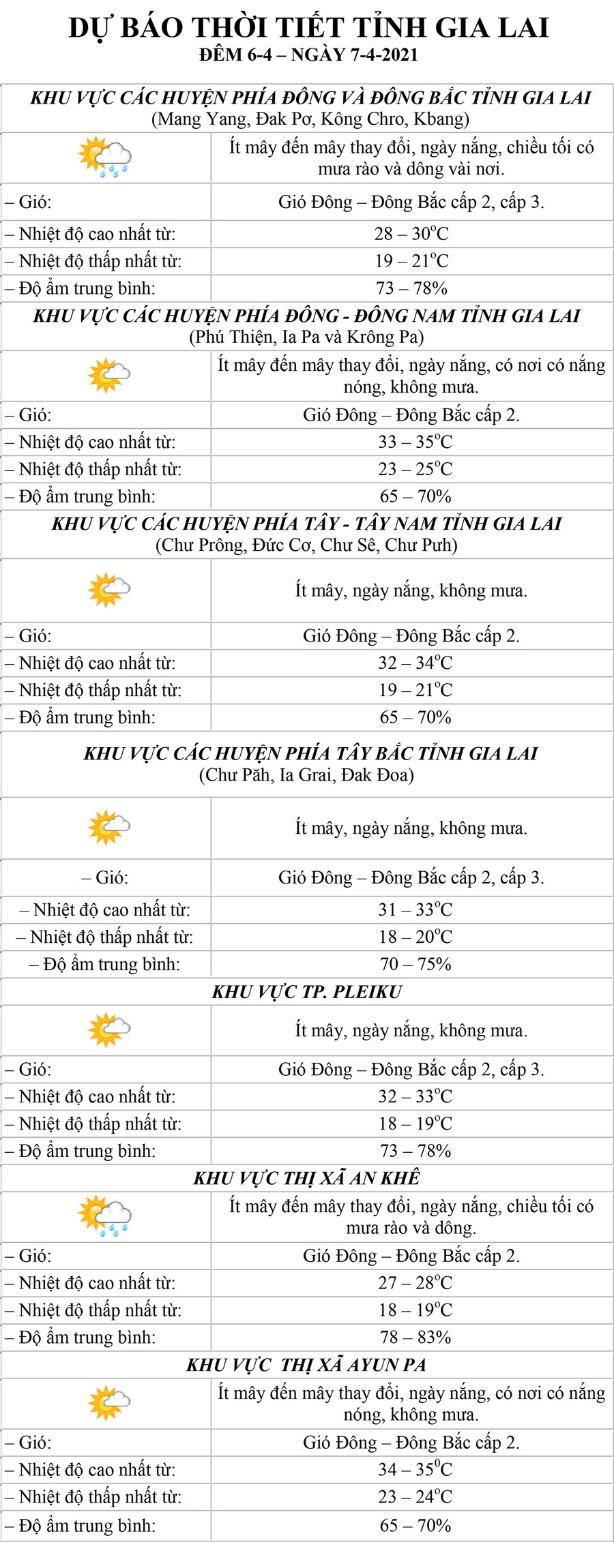 (GLO)- Dự báo thời tiết tỉnh Gia Lai đêm 6-4 và ngày 7-4 tại khu vực: các huyện phía Đông và Đông Bắc, các huyện phía Đông-Đông Nam, các huyện phía Tây-Tây Nam, các huyện phía Tây Bắc, TP. Pleiku, thị xã An Khê và thị xã Ayun Pa.