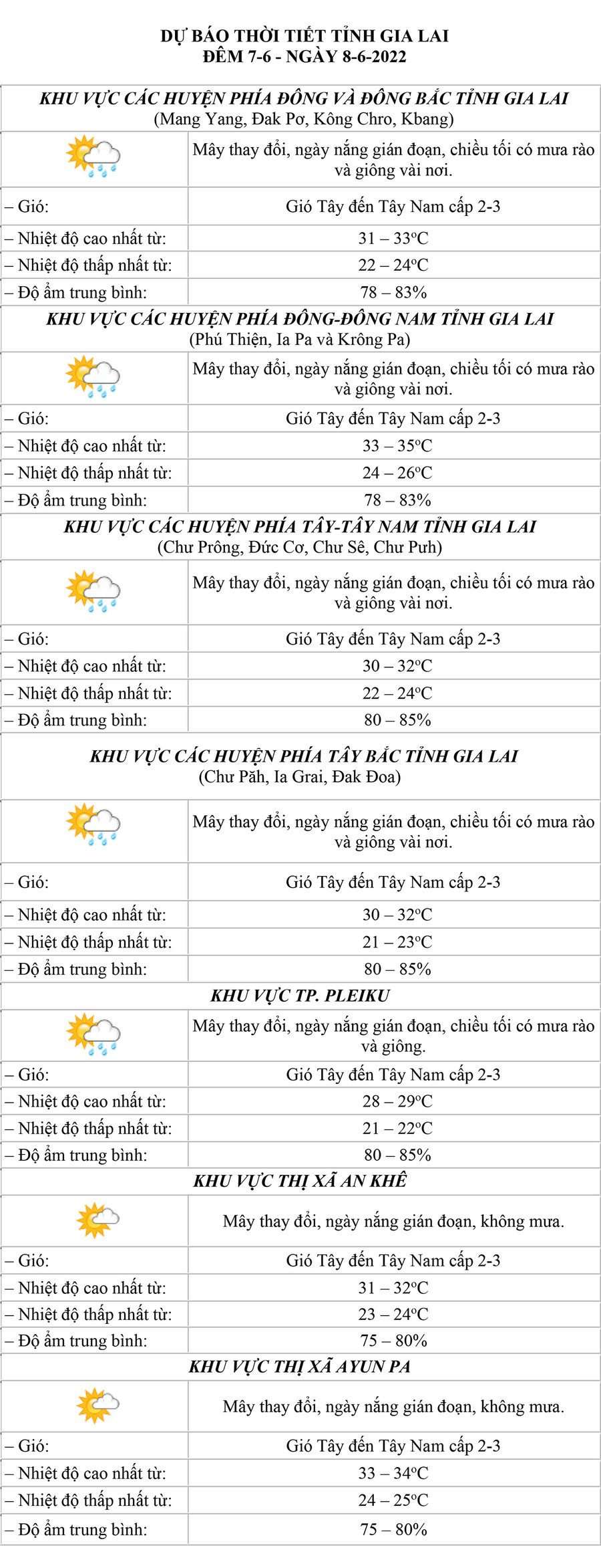 (GLO)- Dự báo thời tiết tỉnh Gia Lai đêm 7-6 và ngày 8-6 tại khu vực các huyện phía Đông và Đông Bắc, các huyện phía Đông-Đông Nam, các huyện phía Tây-Tây Nam, các huyện phía Tây Bắc, TP. Pleiku, thị xã An Khê và Ayun Pa.