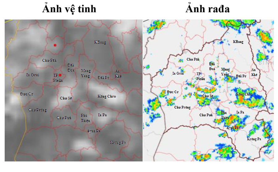 Qua theo dõi trên ảnh ra đa thời tiết Pleiku, ảnh mây vệ tinh cho thấy những vùng mây đối lưu tồn tại trên khu vực các huyện: Kbang, Kông Chro, Ia Pa, Krông Pa, Phú Thiện, Mang Yang, Đak Đoa, Chư Sê, Chư Prông, Đức Cơ, Ia Grai, Chư Păh, thị xã Ayun Pa và TP. Pleiku. Hiện tại những vùng mây này có xu hướng phát triển và mở rộng thêm.