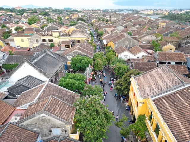Ánh nắng vàng dịu nhẹ buông xuống phố cổ, chiếu rọi lên những ngôi nhà cổ kính mái ngói đỏ tươi. Hàng ngàn chiếc đèn lồng đủ màu sắc được treo dọc theo con đường, tạo nên một không gian lung linh, huyền ảo. Giữa khung cảnh cổ kính ấy, du khách thập phương lại càng nổi bật với những bộ áo dài truyền thống, những bộ cánh sặc sỡ.