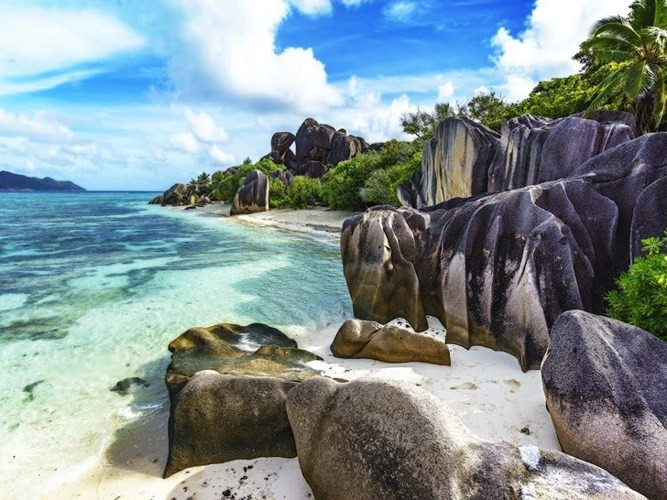 Bãi biển Anse Source d'Argent, Seychelles. Một bãi biển cát trắng đẹp như tranh vẽ được tô điểm bởi những tảng đá granite được chạm khắc tự nhiên với nước màu ngọc lục bảo.