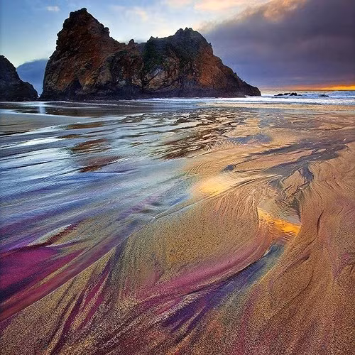 Bãi biển cát tím, California, Mỹ. Cát tím được hình thành khi các mỏ mangan từ các ngọn đồi xung quanh bị xói mòn ra biển.