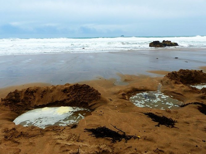 Bãi biển nước nóng, New Zealand. Nếu bạn ghé thăm bãi biển này, bạn sẽ thấy du khách đào hố trên cát và sau đó ngâm mình trong đó. Nước được lọc qua cát sẽ rất nóng.