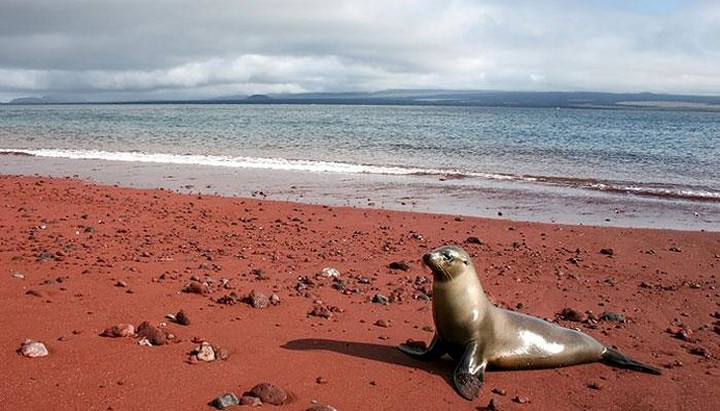 Bãi biển Cát Đỏ, Rabida, Galapagos. Màu đỏ của cát trên bãi biển là do quá trình ôxi hóa nham thạch giàu sắt.