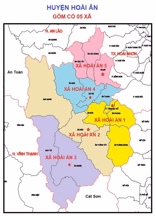 Huyện Hoài Ân sẽ thành lập 5 xã, gồm xã Hoài Ân 1, xã Hoài Ân 2, xã Hoài Ân 3, xã Hoài Ân 4, xã Hoài Ân 5.