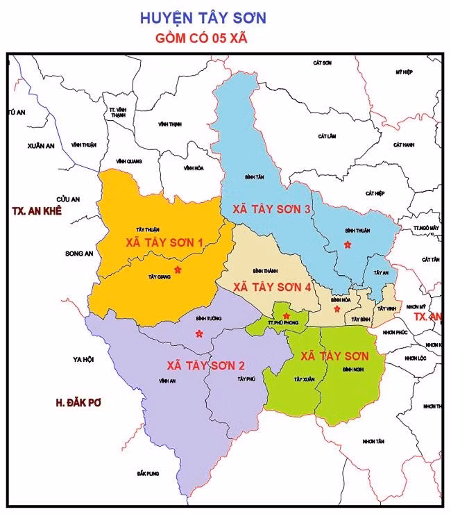 Huyện Tây Sơn sẽ thành lập 5 xã, gồm xã Tây Sơn, xã Tây Sơn 1, xã Tây Sơn 2, xã Tây Sơn 3, xã Tây Sơn 4.