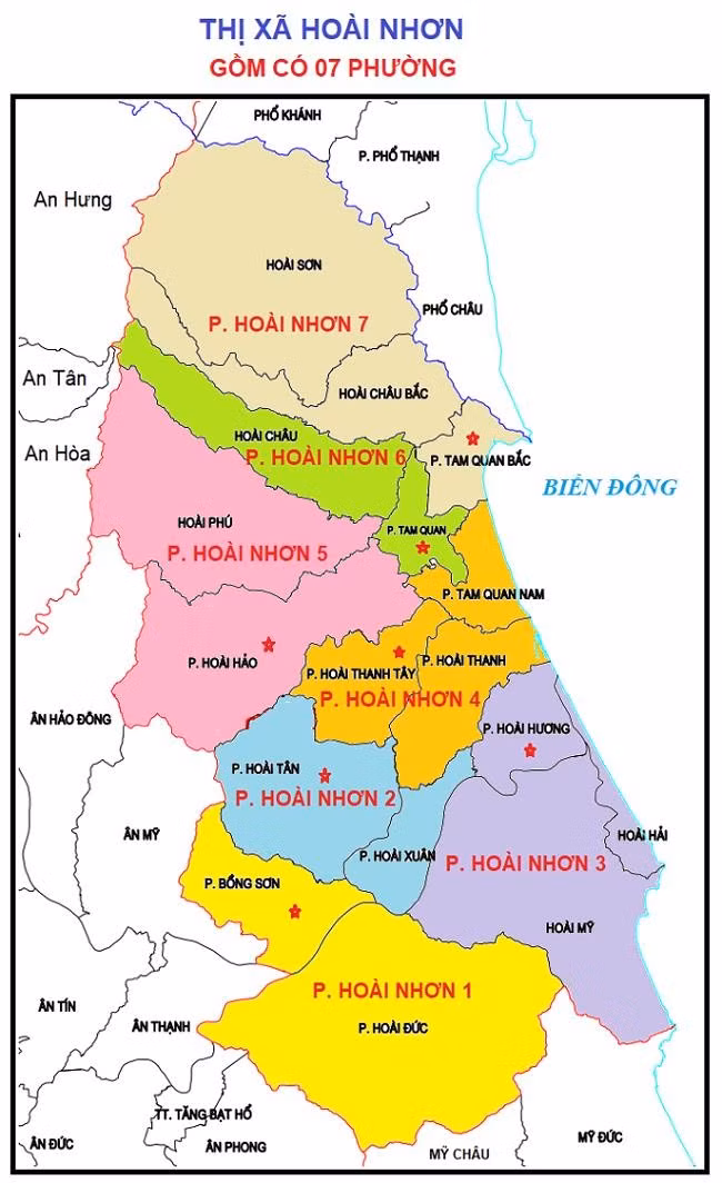 TX Hoài Nhơn sau sắp xếp sẽ thành lập 7 phường, gồm phường Hoài Nhơn 1, phường Hoài Nhơn 2, phường Hoài Nhơn 3, phường Hoài Nhơn 4, phường Hoài Nhơn 5, phường Hoài Nhơn 6, phường Hoài Nhơn 7.