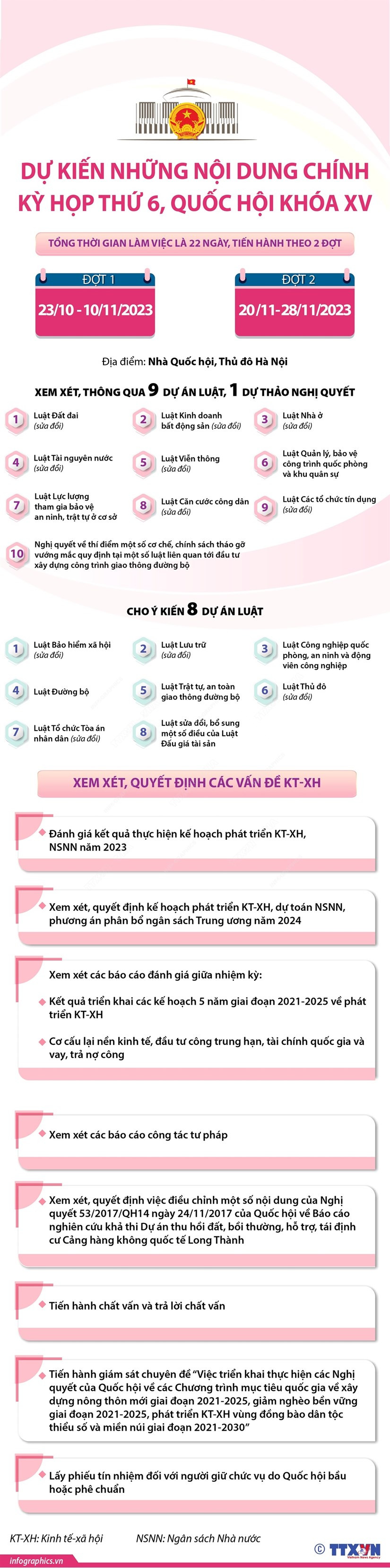 Kỳ họp thứ 6 Quốc hội khóa XV khai mạc trọng thể ngày 23/10, dự kiến bế mạc ngày 28/11 theo hình thức họp tập trung tại Nhà Quốc hội, Thủ đô Hà Nội.