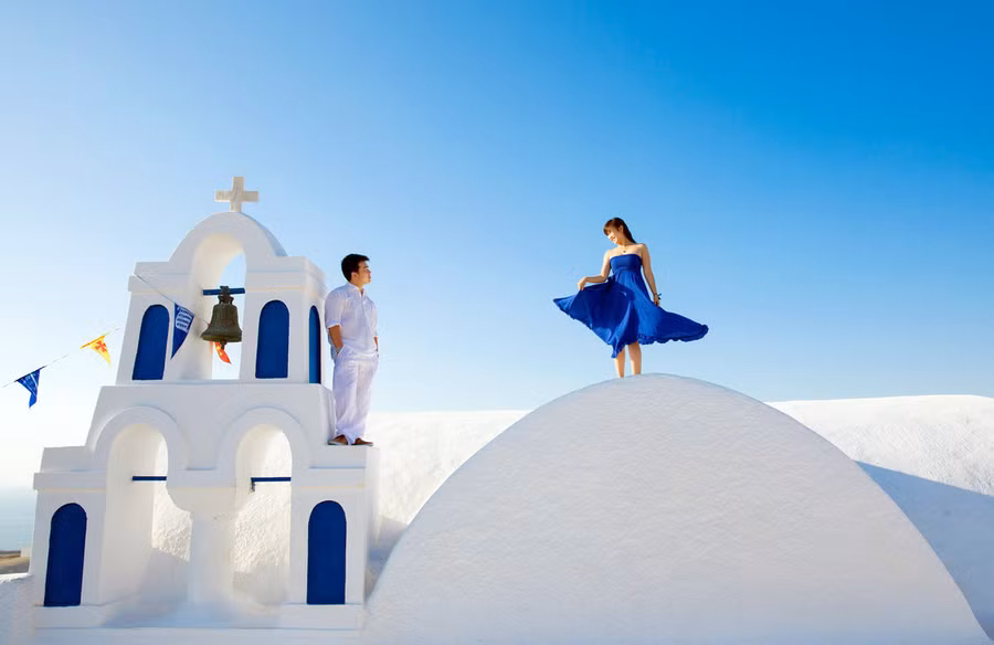 Santorini được ví như thiên đường ở vùng biển Địa Trung Hải. Hòn đảo xinh đẹp này nằm ở miền nam biển Aegea, cách Hy Lạp 200km về phía đông nam. Màu sắc đặc trưng của Santorini là trắng và xanh nên tạo hiệu ứng đẹp mắt cho các bức ảnh cưới.