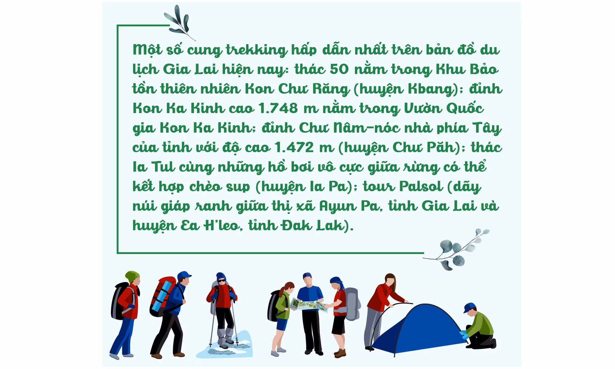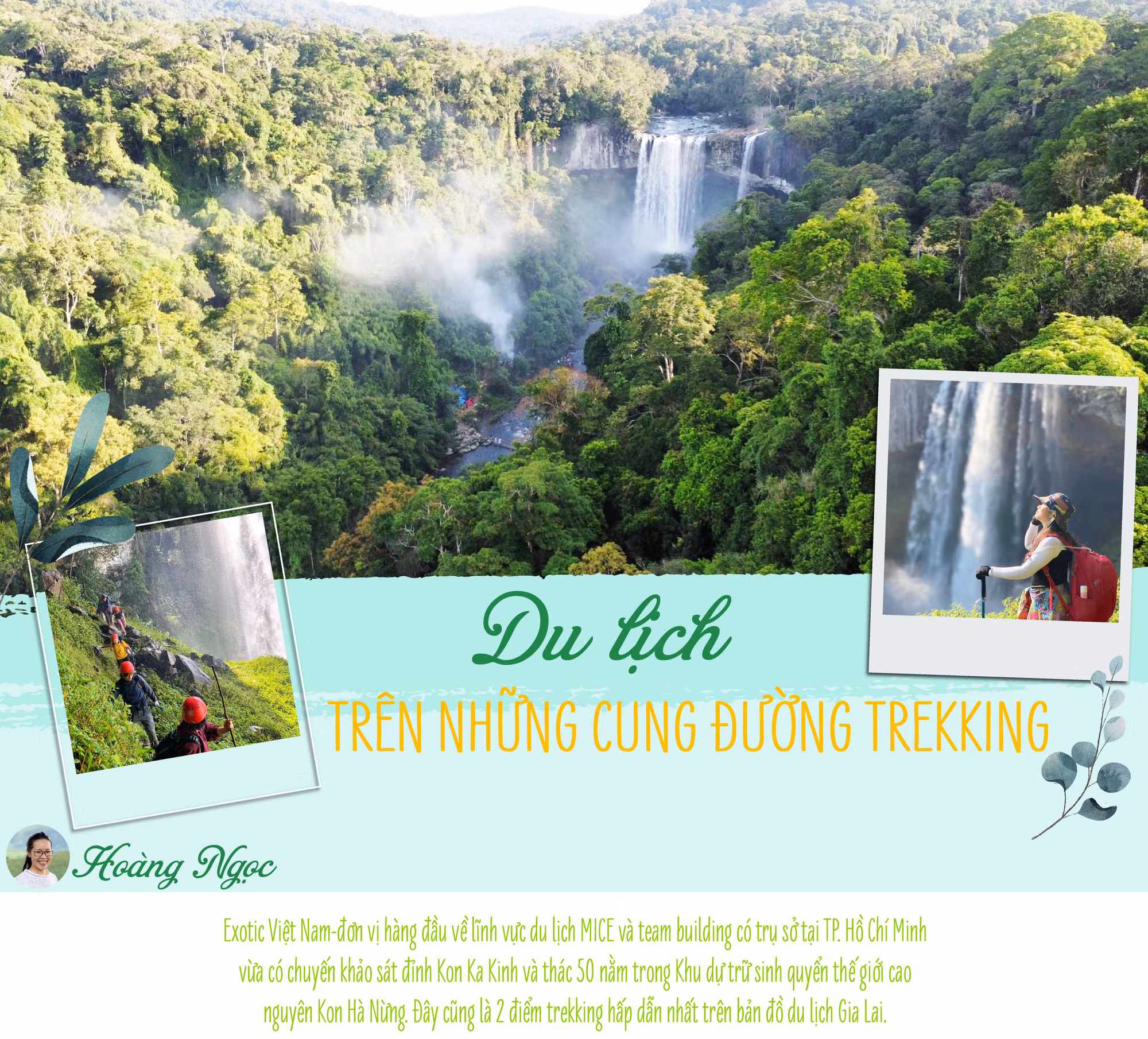 Ông Trương Hoàng Phương-Giám đốc Công ty Exotic Việt Nam từng là nhà địa lý và là người tham gia vẽ bản đồ Việt Nam làm trưởng đoàn khảo sát 2 điểm trekking nói trên. Trước đó, ông cùng đoàn công tác do Phó Chủ tịch UBND TP. Hồ Chí Minh Phan Thị Thắng làm trưởng đoàn đã khảo sát tiềm năng phát triển du lịch Vườn Quốc gia Kon Ka Kinh. Chuyến công tác đó là tiền đề cho lần quay trở lại này của Exotic Việt Nam để khảo sát sâu hơn các tuyến, điểm hấp dẫn của Vườn Quốc gia và Khu Bảo tồn thiên nhiên Kon Chư Răng. Chị Vũ Thị Trinh-hướng dẫn viên kỳ cựu của Vườn Quốc gia Kon Ka Kinh là người trực tiếp dẫn đoàn Exotic Việt Nam khảo sát đỉnh Kon Ka Kinh-nóc nhà Gia Lai ở độ cao 1.748 m. Chị Trinh cho biết, với tổng diện tích gần 42 ngàn ha, Kon Ka Kinh là nơi duy nhất ở Việt Nam có kiểu rừng hỗn giao bao gồm các loài cây lá rộng và lá kim. Cung đường trekking có quá nhiều thứ để trải nghiệm mà lịch trình 3 ngày 2 đêm không thể khám phá hết.