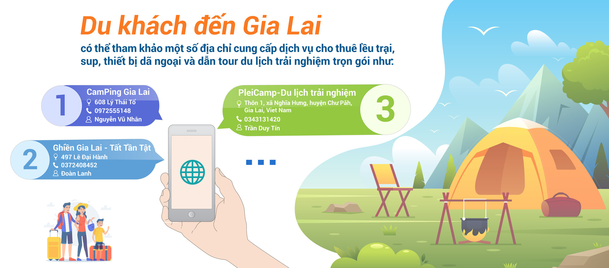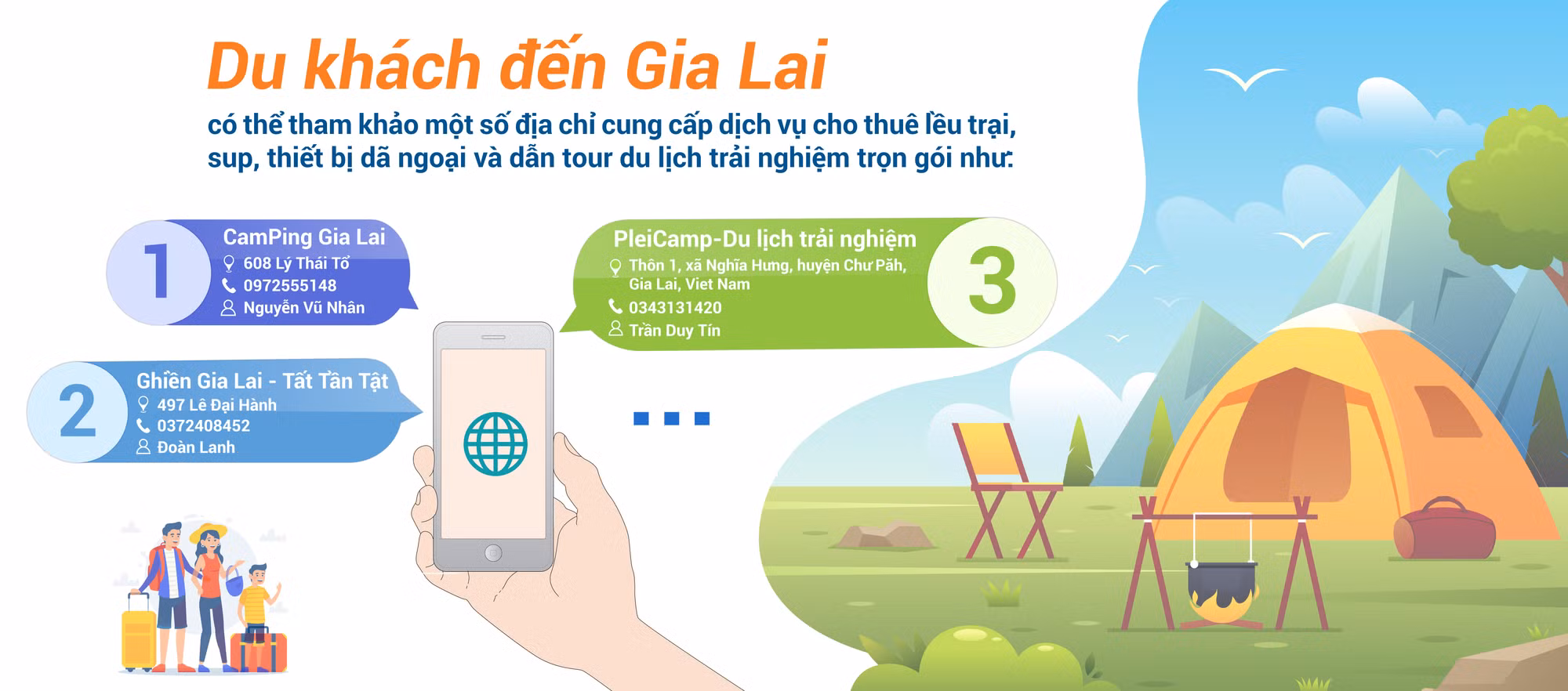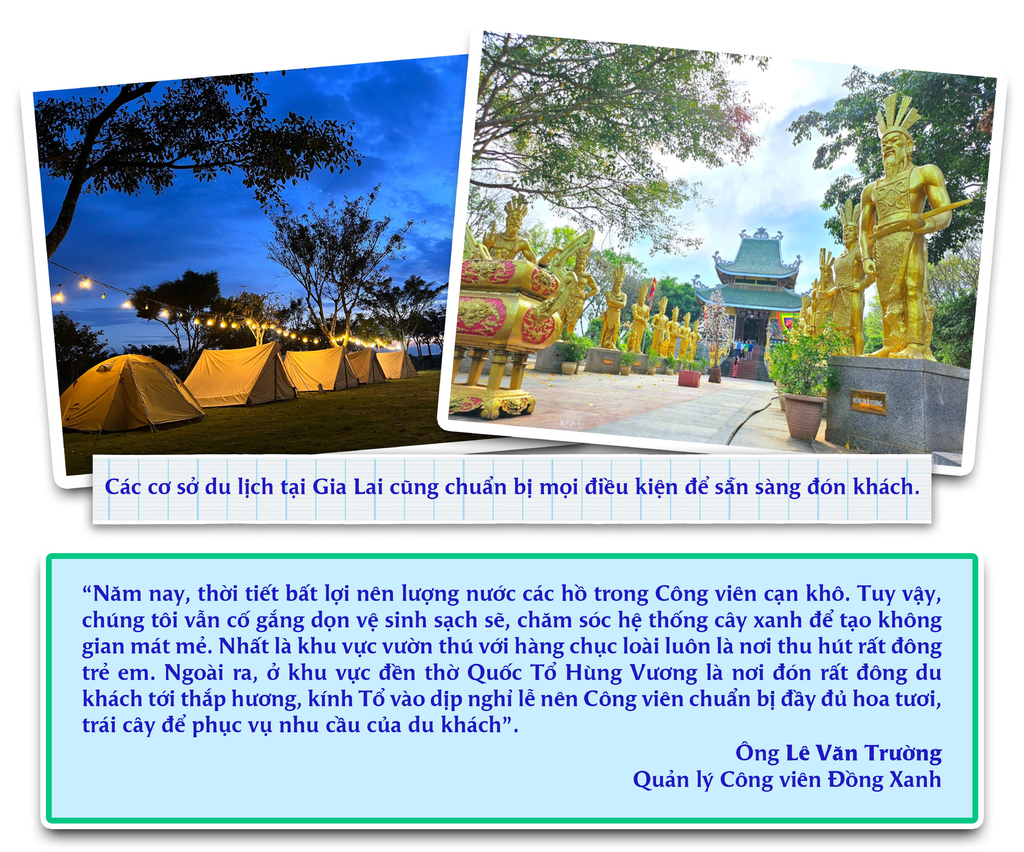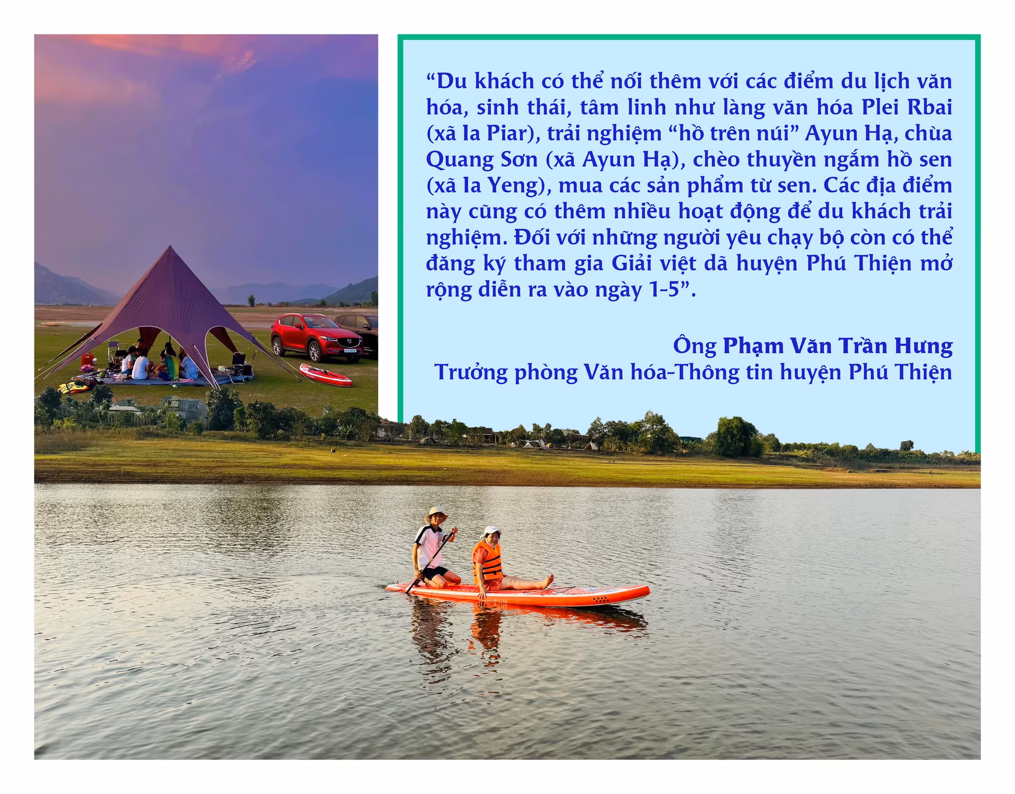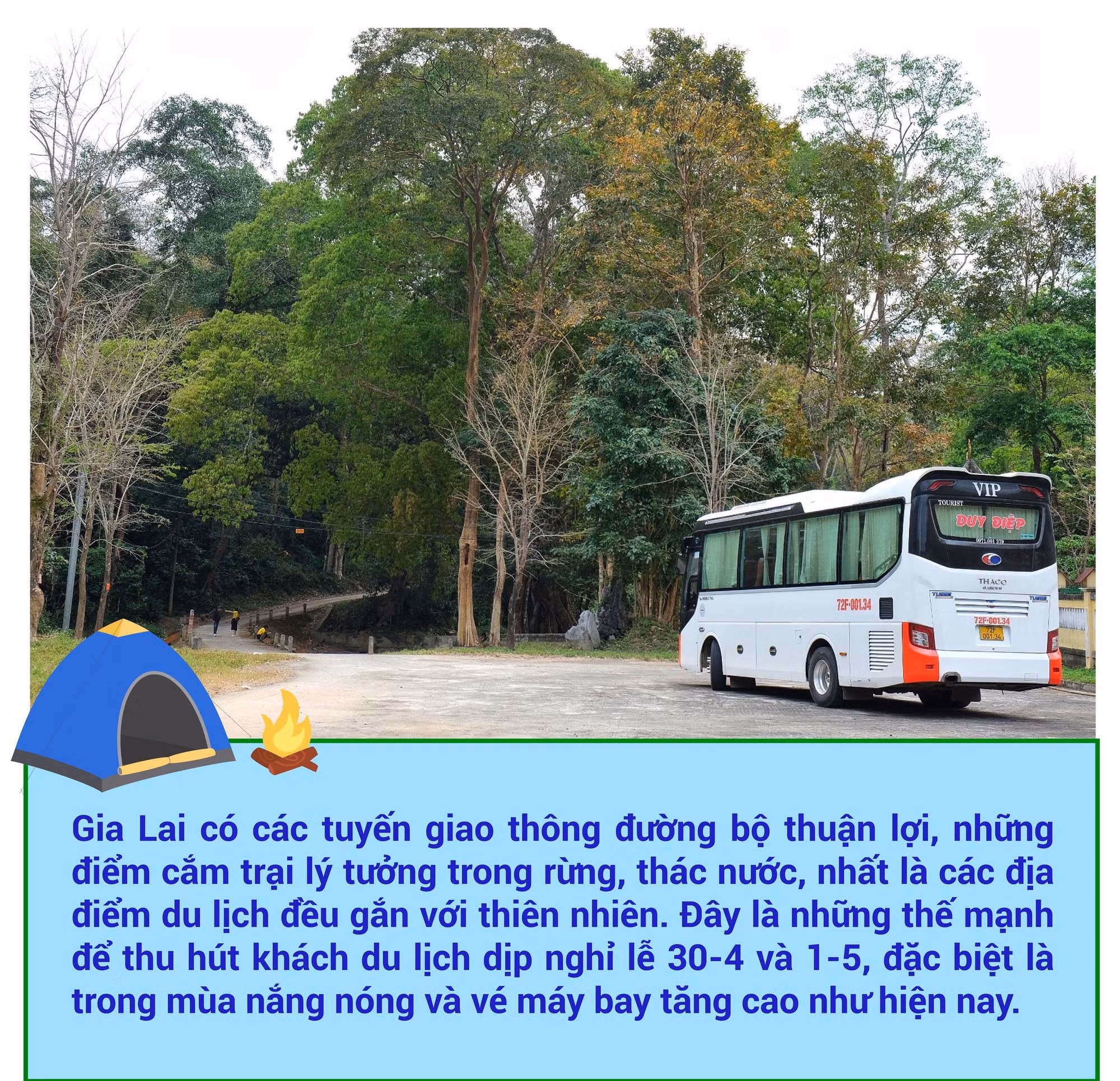 Để phục vụ xu hướng du lịch xanh trong dịp nghỉ lễ, dịch vụ cho thuê lều trại, sup và dịch vụ lưu trú gần gũi với thiên nhiên tại Gia Lai đều đã có sự chuẩn bị từ trước. Anh Đoàn Lanh (người tạo kênh “Ghiền Gia Lai-Tất Tần Tật” và cho thuê dịch vụ cắm trại) cho hay: “So với kỳ nghỉ lễ năm trước thì lượng khách thuê lều trại năm nay tăng cao hơn hẳn. Một phần bởi thời tiết nắng nóng, mọi người có xu hướng nghỉ ngơi ở những nơi mát mẻ, có cây, có nước. Bầu trời cao nguyên mùa này vào lúc sáng sớm hay về chiều có những khoảnh khắc đẹp hiếm có. Chèo sup trên hồ để ngắm hoàng hôn là dịch vụ rất được giới trẻ ưa thích. Gia Lai còn có nhiều điểm lý tưởng để cắm trại như bãi dê ở khu vực cầu treo Biển Hồ, nơi có nhiều cây xanh như: rừng thông Biển Hồ, đồi thông Diên Phú, đồi thông Ia Dêr (huyện Ia Grai), đập Tân Sơn…”.