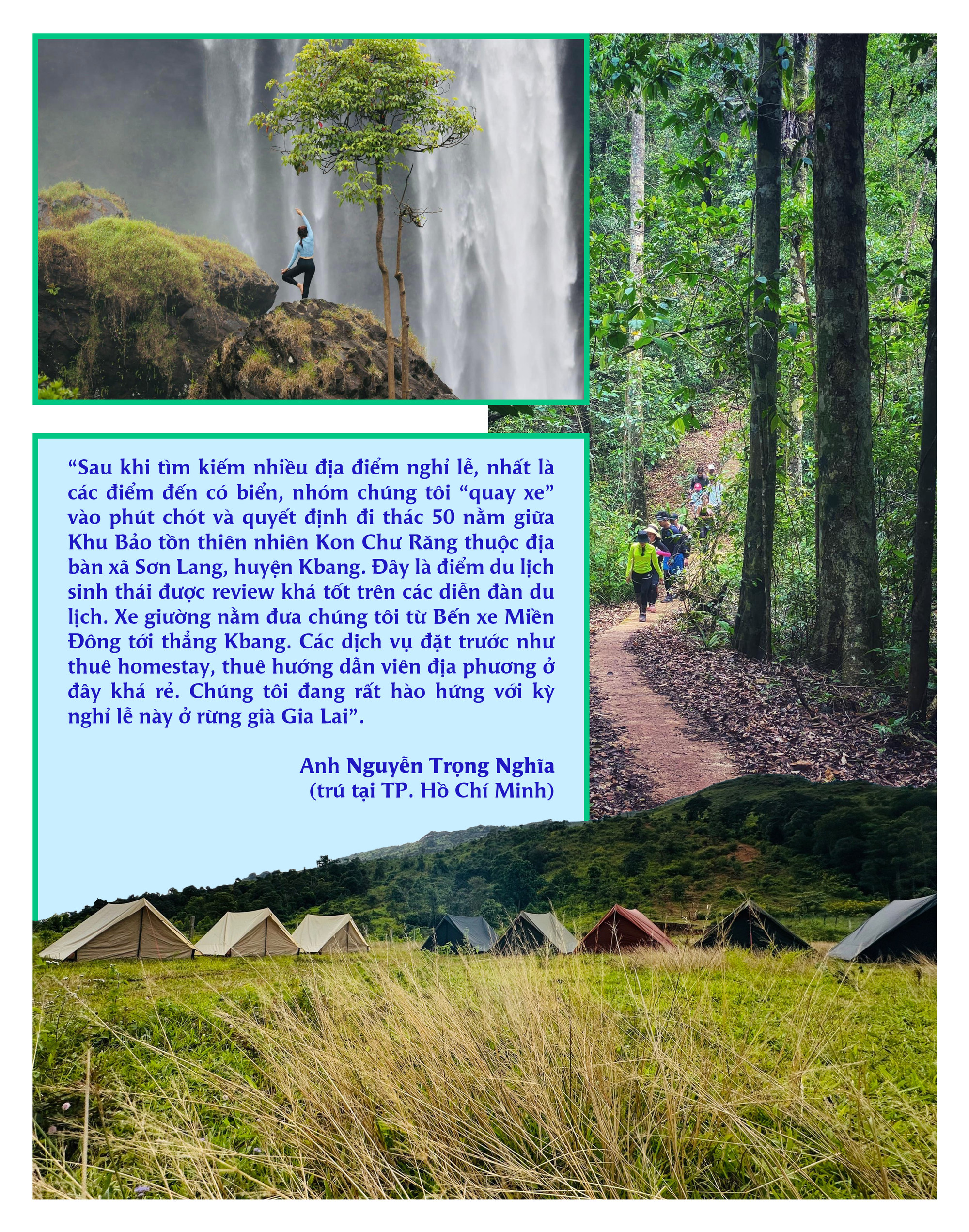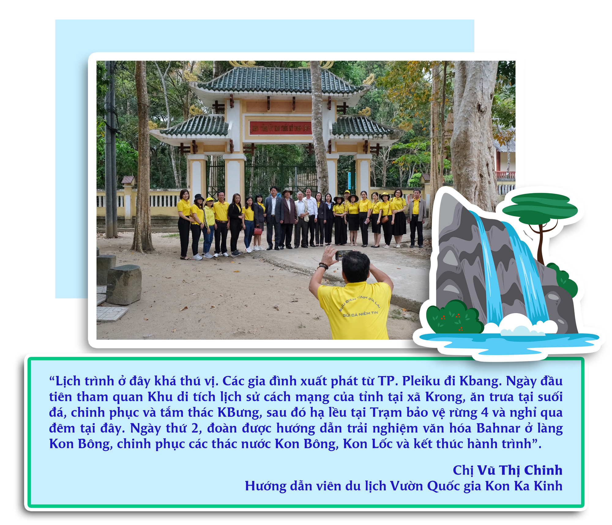 Chị Chinh thông tin thêm: “Dịp nghỉ lễ năm nào cũng có nhiều gia đình đăng ký trải nghiệm tour dạng này. Năm nay, thời tiết nắng nóng nên du lịch sinh thái được nhiều người lựa chọn. Nhằm đảm bảo an toàn cho du khách, chúng tôi chỉ nhận những đoàn đặt trước để chuẩn bị hậu cần chu đáo, bao gồm dịch vụ ăn uống, hướng dẫn viên, chuẩn bị lều trại, túi ngủ qua đêm, đồ tắm suối. Tuyến đi này kết hợp 3 loại hình: du lịch sinh thái, tìm hiểu lịch sử và văn hóa bản địa. Trong đó, làng Kon Bông là nơi ở lâu đời của người Bahnar, kiến trúc, kết cấu nhà cửa và phong tục tập quán hầu như còn nguyên vẹn. Hơn nữa, các điểm đến như khu căn cứ cách mạng hay làng Bahnar đều nằm trong hệ sinh thái rừng nên đây là tour du lịch xanh đúng nghĩa”.