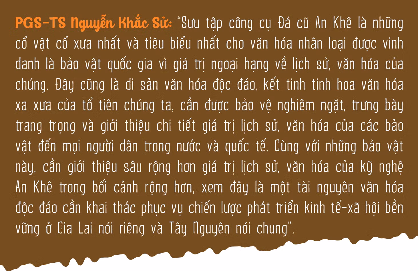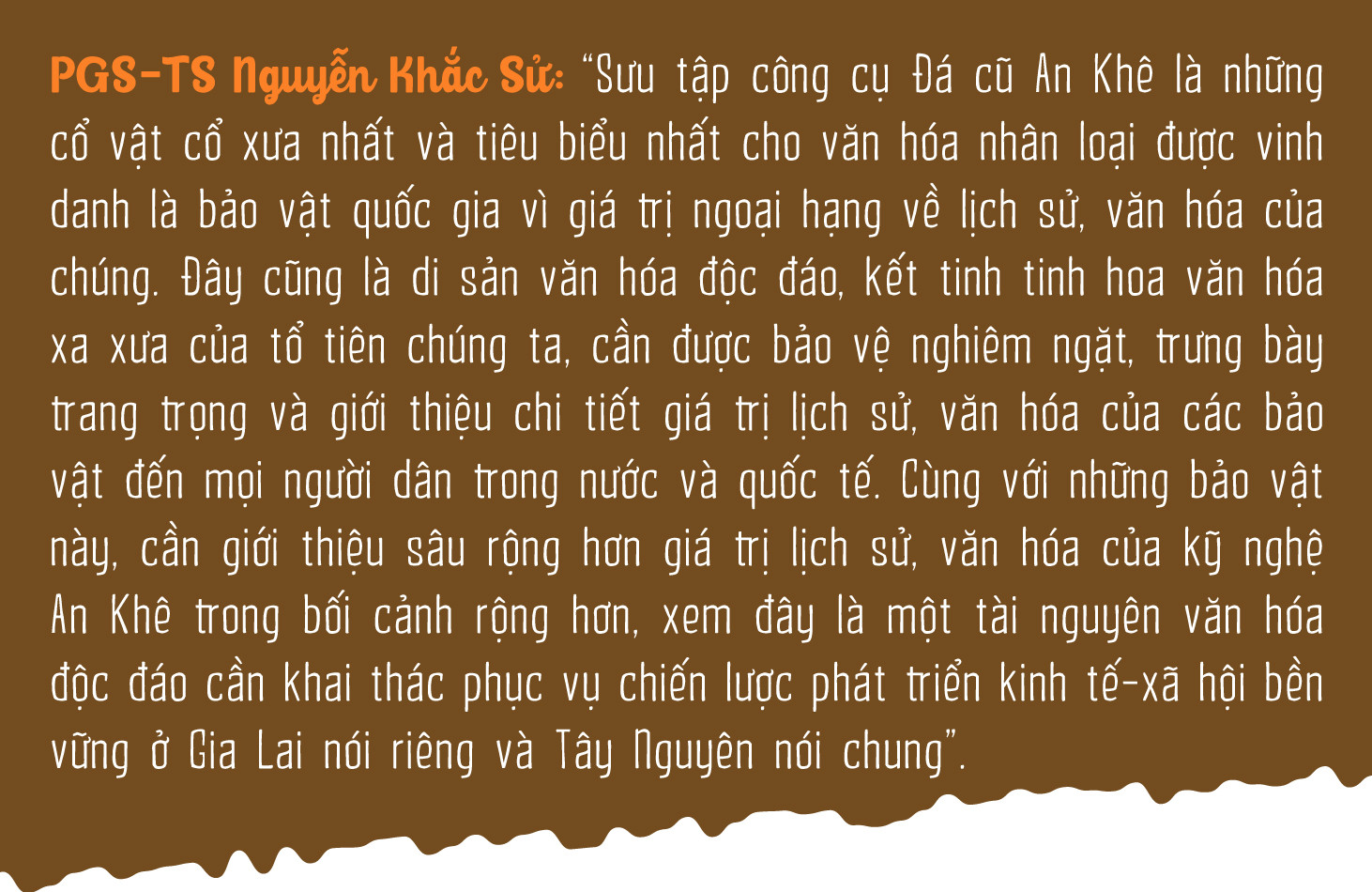 Xét trên phương diện khảo cổ học và mỹ thuật học, những công cụ này đều được cư dân thời đại Đá cũ dồn hết tâm sức chế tác với kỹ thuật cao, tạo ra công cụ có hình dáng cân xứng, thể hiện trình độ tư duy, thẩm mỹ cao của con người cách đây 80 vạn năm. Các chuyên gia Đá cũ trên thế giới tham dự hội thảo quốc tế “Kỹ nghệ Đá cũ An Khê trong bối cảnh kỹ nghệ ghè 2 mặt châu Á” vào tháng 3-2019 tại Gia Lai đều thừa nhận, đây là công cụ độc đáo, tiêu biểu cho kỹ nghệ sơ kỳ Đá cũ. Những công cụ đã đạt đến đỉnh cao của kỹ thuật ghè 2 mặt, một cách tân lớn trong kỹ nghệ chế tác công cụ đá, đồng thời thể hiện năng lực thích ứng thông minh của con người ở đây với môi trường giàu tre nứa như Việt Nam.