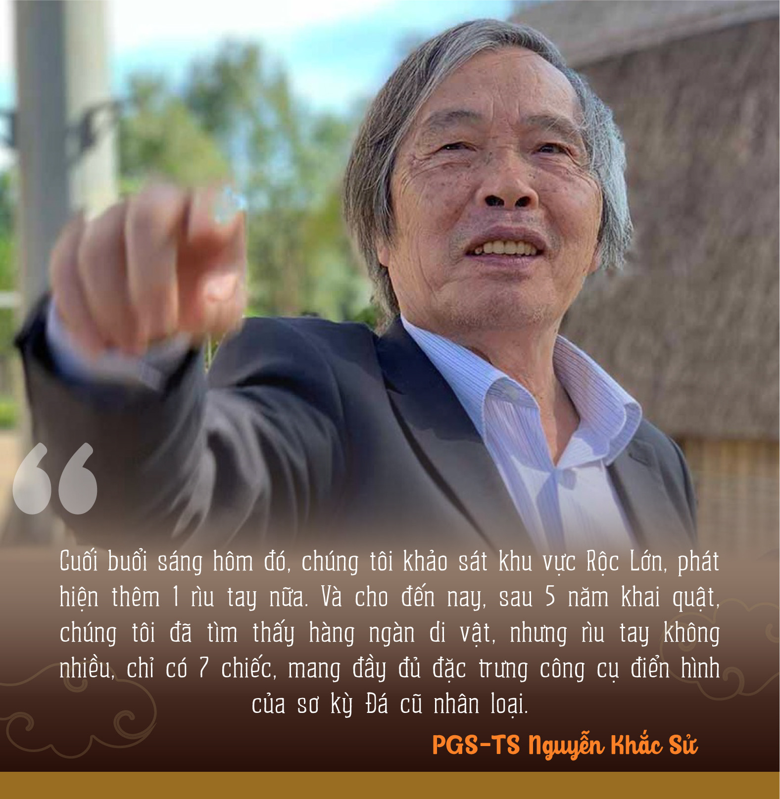 Nhớ lại giây phút lịch sử khi phát hiện chiếc rìu tay đầu tiên, vén bức màn lịch sử hàng vạn năm của loài người, PGS-TS Nguyễn Khắc Sử kể: “Trung tuần tháng 3-2016, trong chuyến điều tra mở rộng tìm kiếm các di tích Đá cũ dọc đôi bờ sông Ba, tôi và các nhà khảo cổ Liên bang Nga liên tiếp phát hiện mới 2 rìu tay, 1 ở di tích Rộc Gáo 1 (phường Ngô Mây) và 1 ở Rộc Lớn (phường An Phước), thị xã An Khê. Sau những nhát cuốc đầu tiên, một phần vỏ cuội vàng óng hiện ra. Tôi dừng lại, dùng bay thận trọng tỉa từng chút đất, công cụ lộ dần. Linh tính báo cho tôi biết, đây là một di vật đặc biệt. Tôi hét lên bằng tiếng Nga: “Phát hiện rìu tay rồi”, các đồng nghiệp Nga lao đến. Tiến sĩ A.Tsybankov chỉ nhìn thấy phần lộ ra đã quỳ xuống bới rộng đất xung quanh, những người khác như A.Kandyba, Phan Thanh Toàn cũng cúi đầu vào công cụ đá dần xuất lộ. Khi A.Tsybankov bới hết đất, cầm rìu giơ lên, anh cũng hô lớn: Rìu tay, rìu tay. Tất cả chúng tôi ôm nhau sung sướng. Các phóng viên VTV đã quay được thước phim này, một phát hiện đi vào lịch sử. Một chiếc rìu tay tuyệt đẹp đã được phát hiện như vậy”.