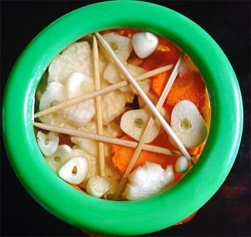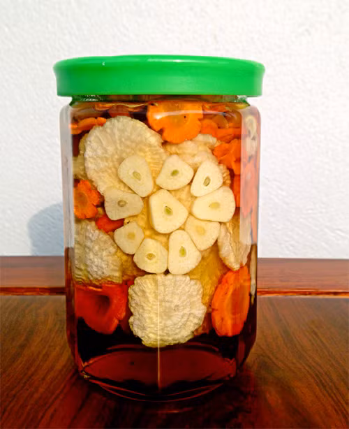 Bước 4: Rau củ đã sấy được 1 tiếng thì tắt lò, lấy ra để nguội rồi xếp vào lọ thuỷ tinh cùng tỏi đã bào khi nãy. Dùng tăm hoặc que tre chèn trên mặt rồi đổ nước mắm vào, đậy nắp lọ và để nơi thoáng mát, 2 ngày sau là có thể dùng dần.