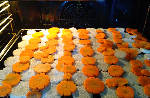 Bước 2: Đổ cà rốt, củ cải ra rổ, dùng khăn vắt kiệt nước muối, rửa lại bằng nước lạnh rồi lại vắt khô, rửa và vắt 3 lần như thế để rau củ không bị mặn. Xếp rau củ lên vỉ nướng, chỉnh lò 100 độ C chế độ có quạt gió, cho vỉ rau củ vào tầng thứ 2 của lò (từ dưới đếm lên) sấy 1 tiếng.
