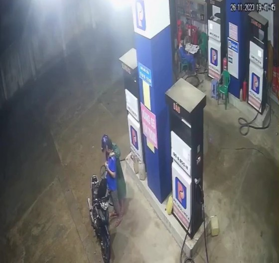 Theo camera an ninh ghi lại lúc 19 giờ 42 phút ngày 26-11, một người đàn ông đi xe máy sẫm màu, mặc áo mưa đến đổ xăng tại cây xăng Tiên Cảnh (huyện Tiên Phước).