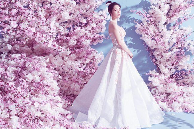 Trong một vài thiết kế khác, họa tiết hoa đào rơi được đính nổi cùng phần chân váy xòe phồng khiến người đẹp màn ảnh trông như một nàng công chúa bước ra từ truyện cổ tích.