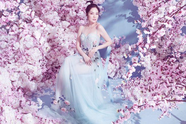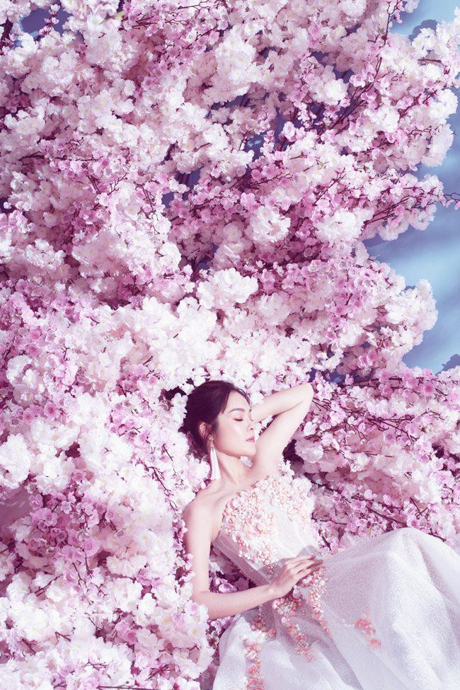 Giữa bối cảnh ngập tràn hoa đào, Dương Cẩm Lynh diện những thiết kế cúp ngực hoặc xuyên thấu, với tông màu pastel ngọt ngào, khoe trọn khuôn ngực đầy và bờ vai mảnh khảnh.