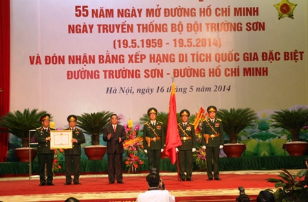 (GLO)- Với những đóng góp to lớn của mình, tuyến đường Hồ Chí Minh đi qua 11 tỉnh (Nghệ An, Hà Tĩnh, Quảng Bình, Quảng Trị, Thừa Thiên-Huế, Quảng Nam, Kon Tum, Gia Lai, Đak Lak, Đak Nông, Bình Phước) đã được Thủ tướng Chính phủ ban hành Quyết định số 2383/QĐ/TTg về việc xếp hạng Di tích Quốc gia đặc biệt- "Di tích Lịch sử đường Trường Sơn-đường Hồ Chí Minh" vào ngày 9-12-2013.