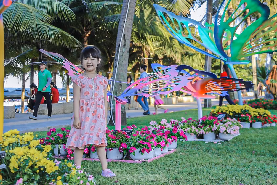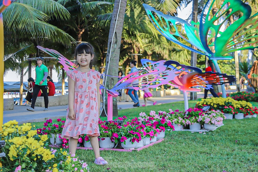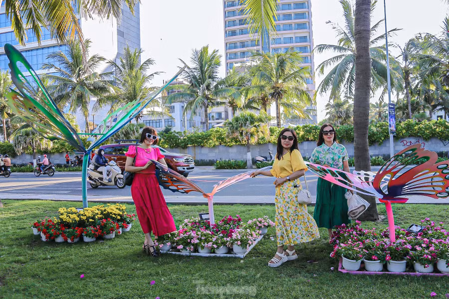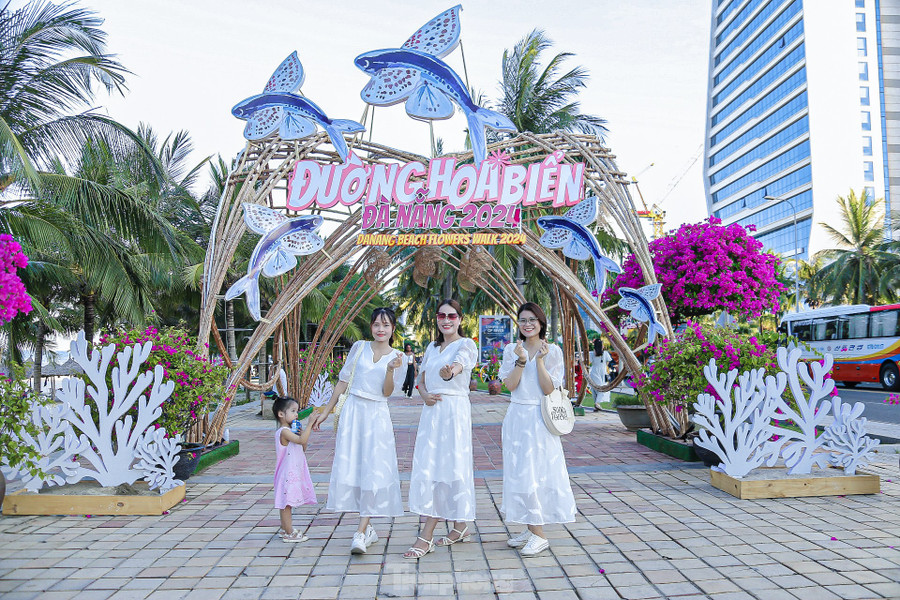 | Nhiều du khách thích thú đi dạo trên đường hoa ven biển, cùng nhau tạo dáng, chụp hình. |