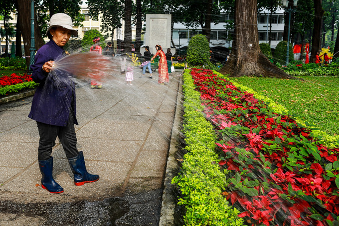"Năm nay, rất nhiều loại hoa đẹp phục vụ đường hoa Tết nên khu vực công viên 23-9 không trưng bày nhiều chậu hoa kiểng như mọi năm", nữ công nhân chăm sóc vườn hoa cho biết.