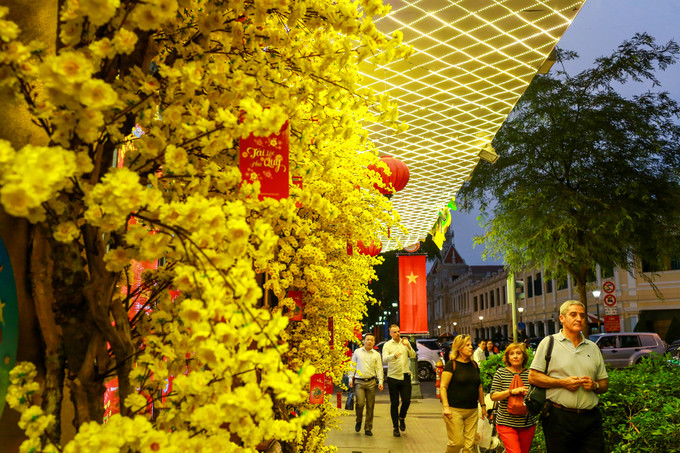 Du khách rảo bước trên vỉa hè đường Lê Thánh Tôn - Đồng Khởi rợp hoa mai vàng.