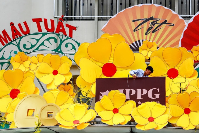 Những ngày giáp Tết, nhiều tuyến đường trung tâm TP HCM như Lê Duẩn, Phạm Ngọc Thạch… rộn ràng không khí Tết. Tại đường hoa Nguyễn Huệ (quận 1), công tác trang trí đang được gấp rút hoàn tất để kịp ngày khai mạc (28 tháng Chạp, tức ngày 13-2).
