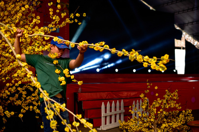 Công nhân vẫn dùng những cành hoa mai nhựa để trang trí sân khấu tại Nhà Văn hóa Thanh niên trong dịp Tết.
