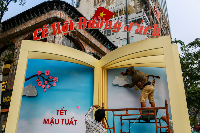 Trên góc đường Nguyễn Huệ - Mạc Thị Bưởi, nhóm công nhân khác cũng tất bật hoàn thiện các tiểu cảnh phục vụ lễ hội đường sách.