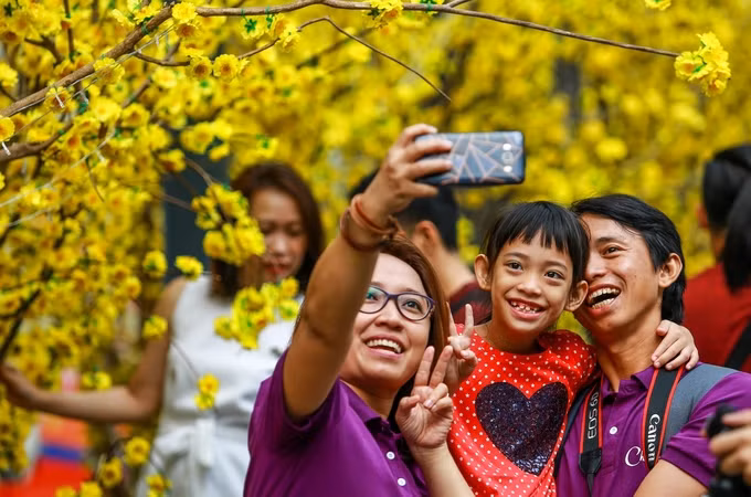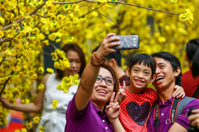 Gia đình chị Hiếu (quận Bình Thạnh) chụp hình lưu niệm trên đường hoa mai Phạm Ngọc Thạch (quận 1). "Năm mới Tết về, tôi chỉ cầu chúc cả nhà tràn đầy niềm vui, ai cũng mạnh khỏe và công việc tiến tới", chị Hiếu chia sẻ.