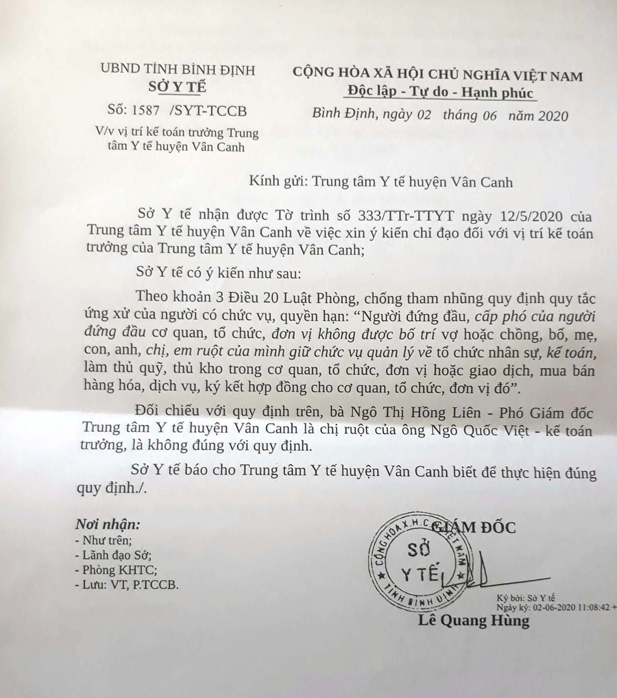 Ngày 2/6, Sở Y tế tỉnh Bình Định phản hồi Trung tâm Y tế huyện Vân Canh rằng, đối chiếu quy định theo khoản 3, Điều 20 Luật Phòng chống tham nhũng quy định quy tắc ứng xử của người có chức vụ quyền hạn, bà Ngô Thị Hồng Liên - Phó Giám đốc Trung tâm là chị ruột ông Ngô Quốc Việt - Kế toán trưởng là không đúng quy định.