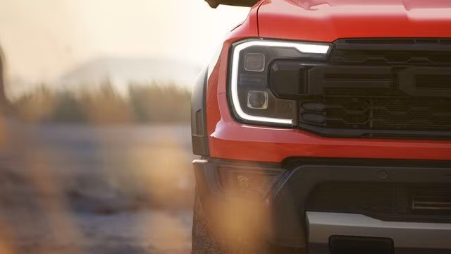 Điểm nhấn tạo nên dáng vẻ rộng ngang của chiếc xe bán tải này là vòm bánh xe vồng ra ngoài, đèn pha hình C đặc trưng của xe tải Ford, dòng chữ F-O-R-D to bản trên lưới tản nhiệt và cản trước được thiết kế tách biệt với lưới tản nhiệt.