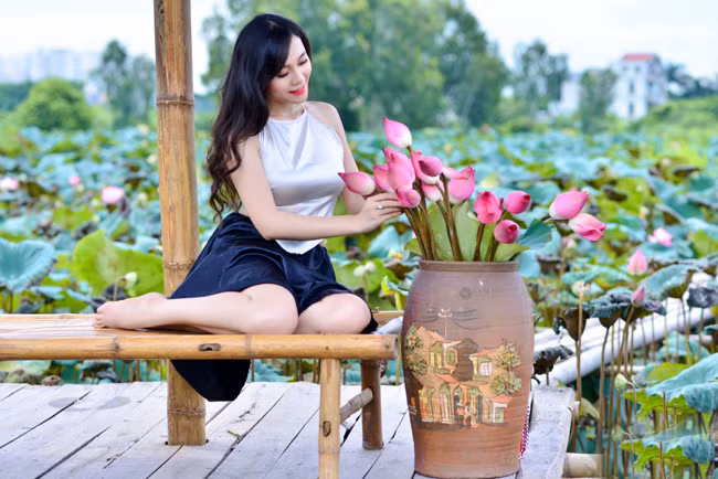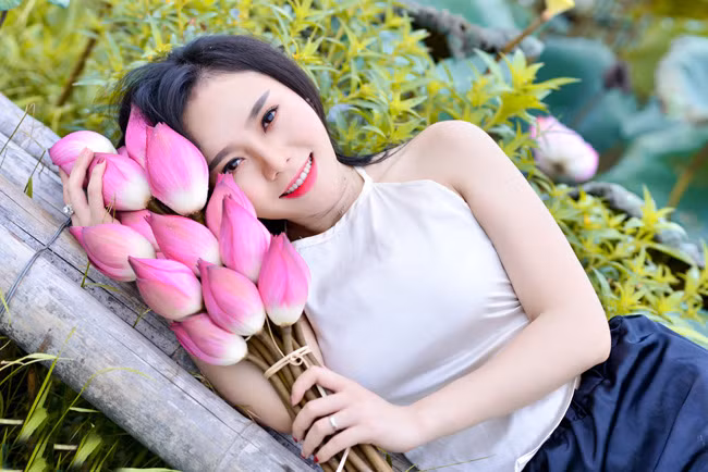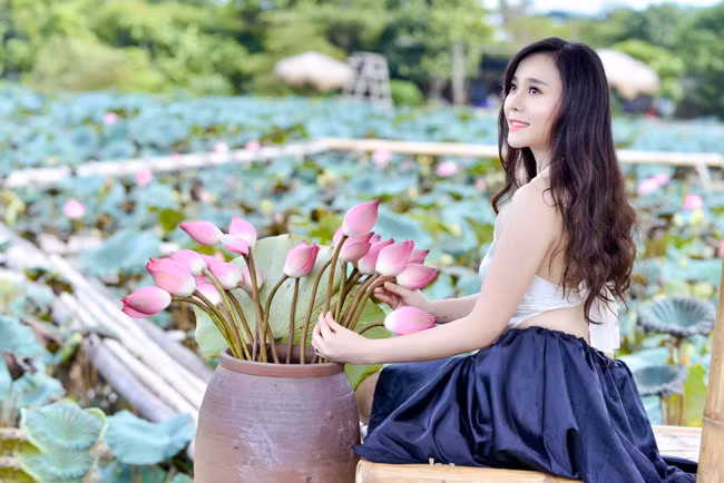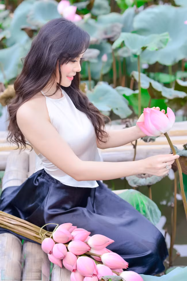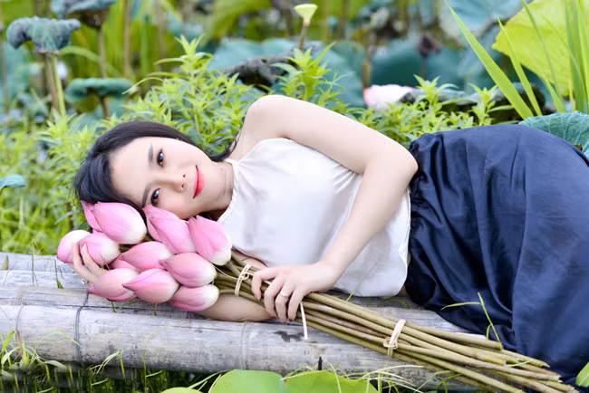 Thế nhưng, khi chụp ảnh với sen, Huyền Trang lại chọn cách tạo dáng bình dị và quen thuộc nhất. Đằng sau đó là một lý do rất đặc biệt...