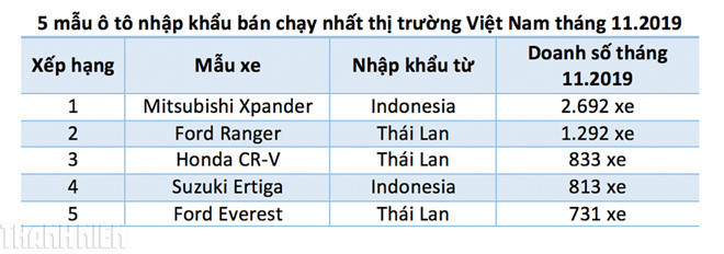 Hiện tại, một số mẫu mã ô tô nhập khẩu như Mitsubishi Xpander, Ford Ranger… đang có doanh số bán khá tốt và liên tục góp mặt trong danh sách 10 ô tô bán chạy nhất tháng tại Việt Nam. Thậm chí, trong tháng 11.2019, mẫu MPV cỡ nhỏ - Mitsubishi Xpander tiếp tục vượt mặt “vua doanh số” Toyota Vios (lắp ráp trong nước) để dẫn đầu thị trường. Các mẫu mã như Suzuki Ertiga (nhập từ Indonesia), Honda CR-V (nhập từ Thái Lan) cũng đạt doanh số bán gần 900 xe.