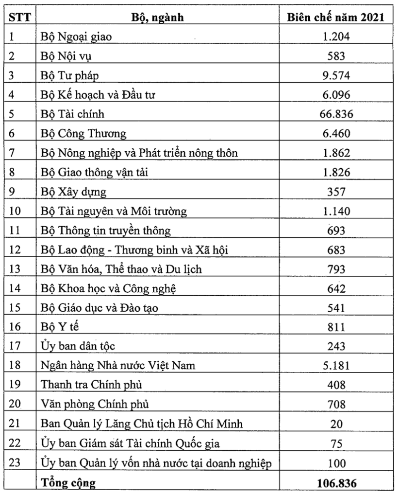 Theo đó, tổng biên chế công chức năm 2021 của các cơ quan, tổ chức hành chính nhà nước, cơ quan đại diện của Việt Nam ở nước ngoài (không bao gồm biên chế của Bộ Công an, Bộ Quốc phòng và cán bộ, công chức cấp xã), biên chế của các Hội có tính chất đặc thù hoạt động trong phạm vi cả nước và biên chế công chức dự phòng là 249.650 biên chế (giảm so với năm 2020 là 3.867 biên chế).