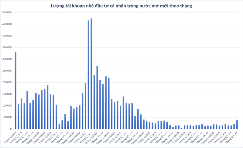 Với số lượng tài khoản của nhà đầu tư trong nước đã tăng thêm gần 330.000 tài khoản trong tháng 7-2024, gấp 3 lần tháng trước và là mức cao nhất trong vòng 2 năm qua, được ghi nhận số lượng tài khoản chứng khoán tại Việt Nam cao thứ 3 trong lịch sử, chỉ sau giai đoạn tháng 5 và 6-2022.