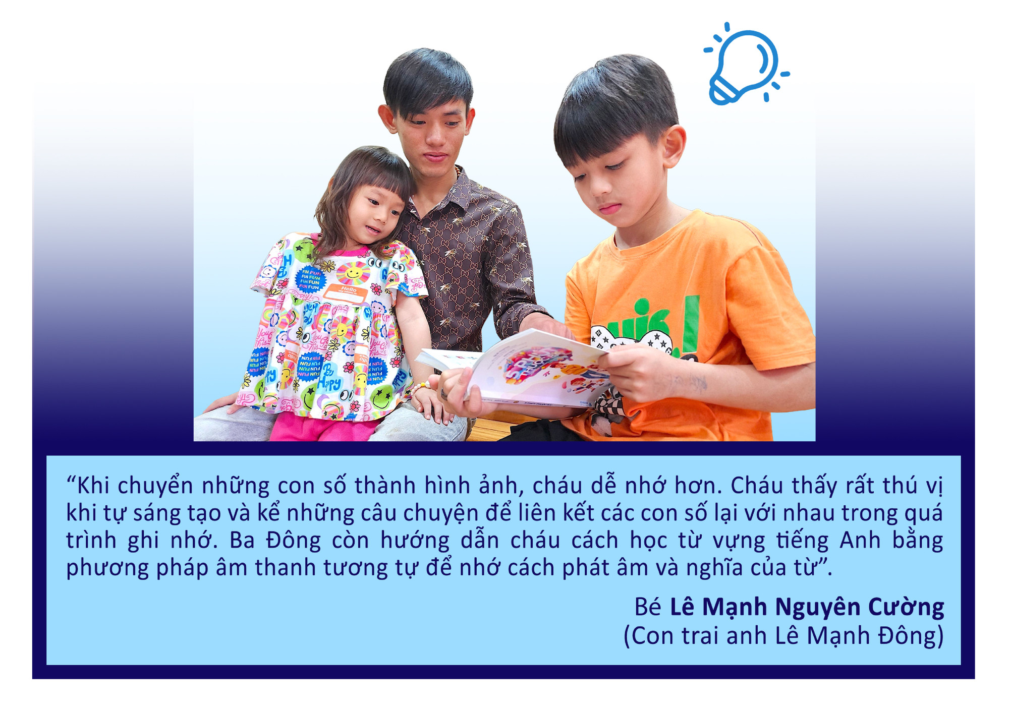 Trước mắt, anh Đông tiếp tục truyền đạt phương pháp cho cậu con trai 9 tuổi và cô con gái 4 tuổi của mình nhằm giúp các con cải thiện trí nhớ trong học tập và có nhiều thời gian để nghỉ ngơi, vui chơi hơn. Với sự hỗ trợ của ba, hiện nay, cậu bé Lê Mạnh Nguyên Cường đang trải qua năm học lớp 3 tương đối nhẹ nhàng, không quá áp lực về bài vở. Cường cũng ghi nhớ được 40 con số ngẫu nhiên trong 3 phút bằng phương pháp kể chuyện, hành trình và mã hóa thành hình ảnh. Riêng phương pháp sơ đồ tư duy, anh Đông chỉ hướng dẫn con trai áp dụng để xâu chuỗi, ghi nhớ những bài học dài.