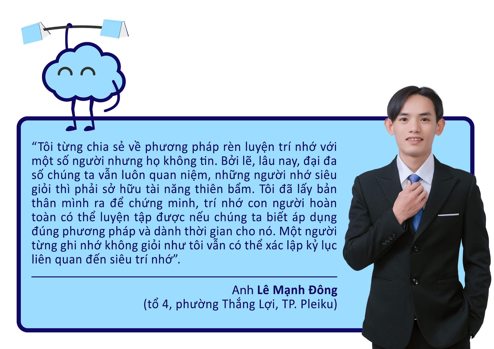Anh Đông nhớ lại: “Thời điểm đó, tôi tình cờ xem chương trình Siêu trí tuệ Việt Nam mùa 2 và khá ấn tượng với cô gái Đặng Ngọc Phương Trinh khi chiến thắng một lúc 2 đối thủ tại thử thách ghi nhớ cực khó. Qua chia sẻ của Trinh, tôi bắt đầu tìm hiểu về bộ môn siêu trí nhớ và biết đến thầy Nguyễn Phùng Phong-Kỷ lục gia siêu trí nhớ thế giới, Chủ tịch Hội đồng Quản trị Công ty cổ phần Đào tạo Tâm Trí Lực. Từ đó, tôi bắt đầu xem và bị thu hút bởi những video clip mà thầy đăng tải trên mạng xã hội liên quan đến việc luyện tập trí nhớ. Tôi cũng thử áp dụng với 50 con số bất kỳ và khá bất ngờ vì bản thân có thể nhớ được chúng chỉ trong vòng 5 phút. Con trai tôi nhờ phương pháp này cũng đã dần cải thiện khả năng ghi nhớ trong học tập”.