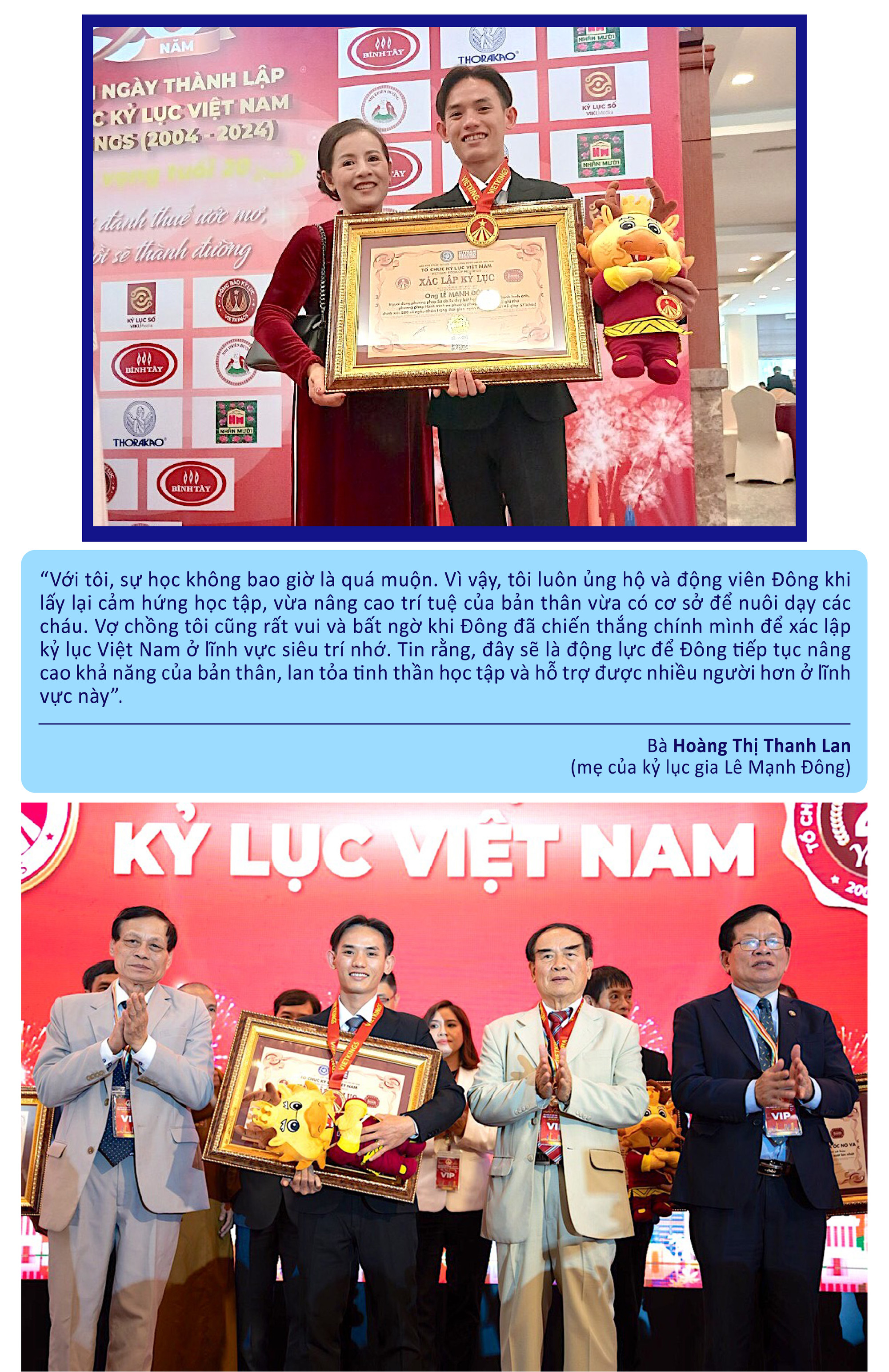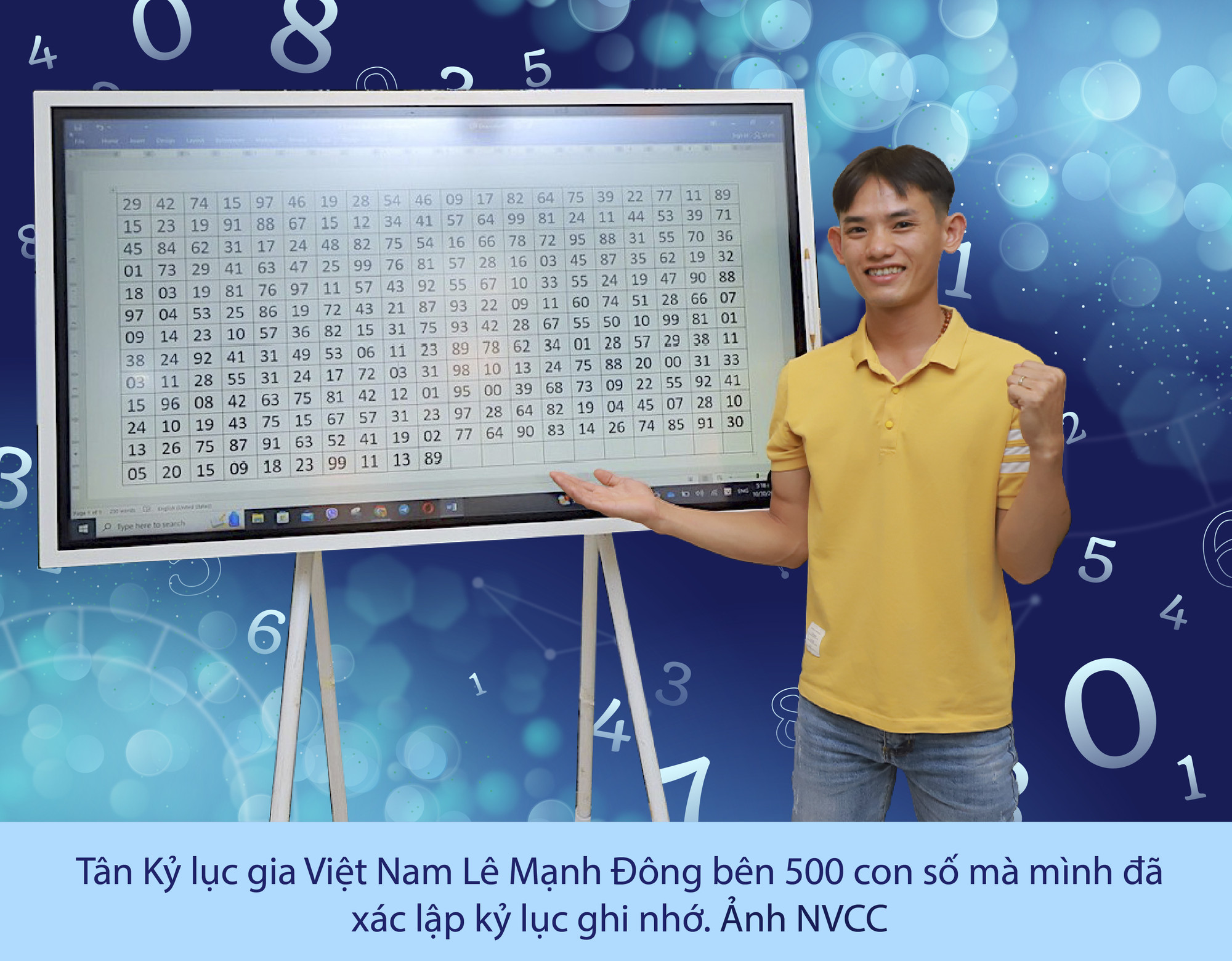 Trở về từ khóa học, anh Đông bắt đầu luyện tập việc ghi nhớ theo từng phương pháp đơn lẻ rồi dần kết hợp các phương pháp lại với nhau để nhớ được nhiều hơn. Từ 50 con số ban đầu, anh bắt đầu tăng dần lên 100, 200, 400 rồi đến 500 số; đồng thời, rút ngắn dần thời gian ghi nhớ. Sau 8 tháng luyện tập khoa học với tinh thần quyết tâm cao, anh Đông tự tin đăng ký tham gia xác lập kỷ lục. Và rồi, niềm vui như vỡ òa khi anh đã chinh phục mục tiêu đề ra và được Tổ chức Kỷ lục Việt Nam xác lập kỷ lục: Người dùng phương pháp sơ đồ tư duy kết hợp mã hóa số thành hình ảnh, phương pháp hành trình và phương pháp kể chuyện để ghi nhớ chính xác 500 số ngẫu nhiên trong thời gian ngắn nhất (14 phút 45 giây 57 khắc). Thời điểm xác lập kỷ lục là ngày 2-1-2024. Với kết quả này, anh Đông đã phá được kỷ lục Việt Nam do chính người thầy Nguyễn Phùng Phong của mình đang nắm giữ (nhớ chính xác 500 con số ngẫu nhiên trong thời gian 15 phút-P.V).