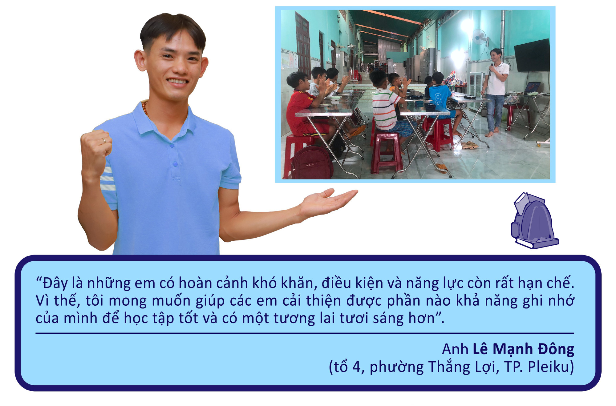 Ngoài thời gian giảng dạy cho các con, hơn 1 tháng trở lại đây, anh Đông còn tổ chức lớp học “siêu trí nhớ” miễn phí vào thứ bảy và chủ nhật hàng tuần tại làng Nhao 2 (xã Ia Kênh, TP. Pleiku) cho 10 em nhỏ người dân tộc thiểu số đang được các xơ thuộc Giáo xứ Thánh Tâm (TP. Pleiku) nuôi dưỡng.