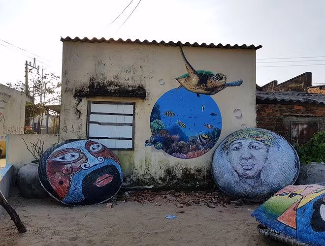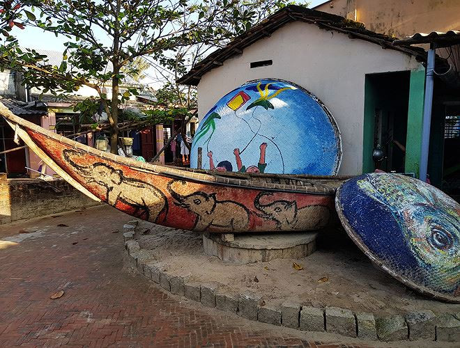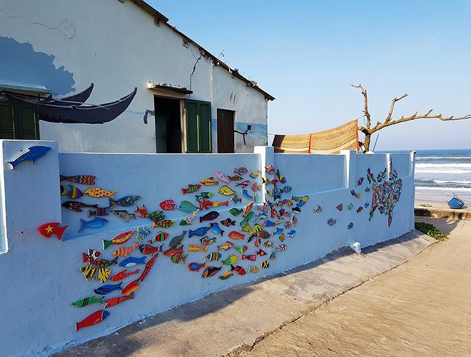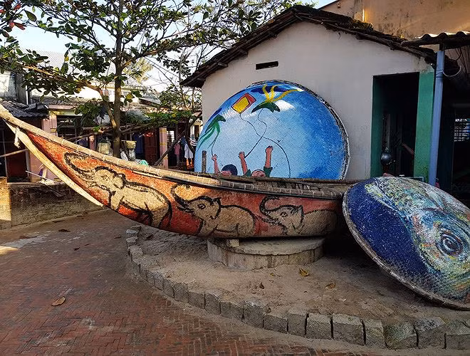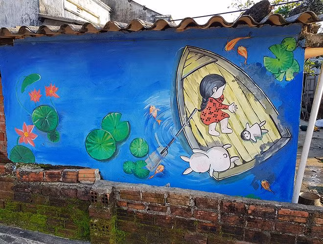 Lối đi giữa các ngôi nhà nhỏ trong làng cũng đầy vẻ thơ mộng. Những phương tiện, dụng cụ đi biển không sử dụng nữa được các nghệ sĩ “biến hóa” thành các tác phẩm bắt mắt.