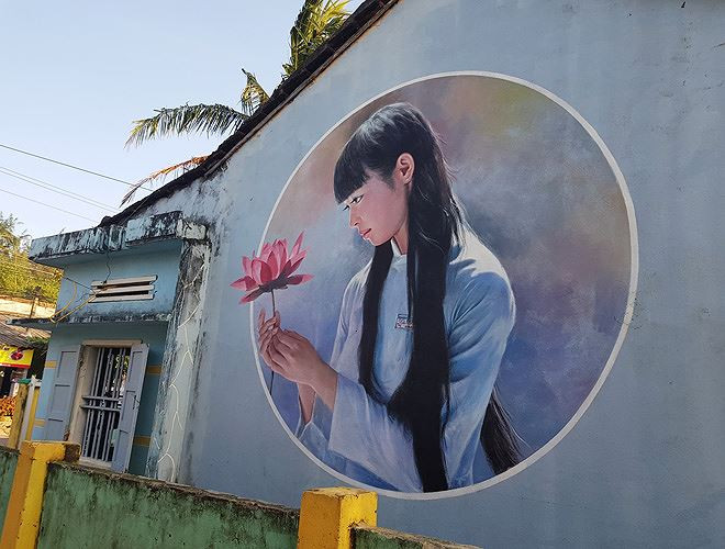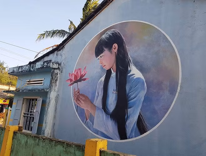 Vẻ đẹp của một nữ sinh miền Trung được tái hiện khiến bức tường nhà khô khan trở nên đầy cuốn hút. Đây cũng là nơi được các bạn trẻ “đóng dấu… điểm đến” nhiều nhất khi đặt chân tới Tam Thanh.