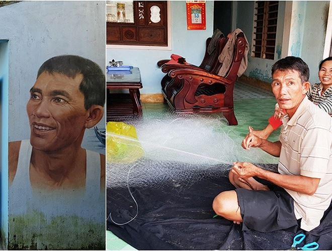 Không chỉ là những hình ảnh thơ mộng, du khách còn được chiêm ngưỡng những bức tranh sinh động khắc họa cuộc sống thường nhật của người dân ven biển. Trong ảnh là ông Liêm - một người dân chài hiền hậu và chất phác trong ngôi nhà mà chân dung của ông được các họa sĩ Hàn Quốc vẽ bên ngoài.